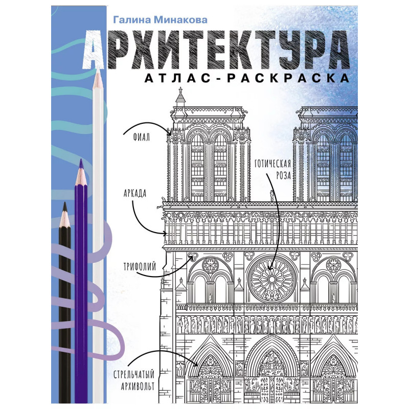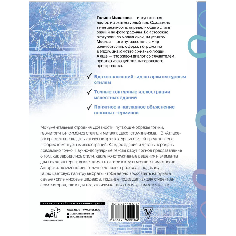 Архитектура. Атлас-раскраска. Галина Минакова - искусствовед, лектор и архитектурный гид. Создатель телеgramм-бота, определяющего стиль зданий по фотографиям. Ее авторские экскурсии по малознакомым уголкам Москвы - это путешествие в мир величественных форм, погружение в эпоху, знакомство с жизнью людей. А еще - это живой диалог со слушателем, приоткрывающий тайны городского пространства. Монументальные строения древности, пугающие образы готики, геометричный симбиоз стекла и металла деконструктивизма В "Атласе-раскраске" двенадцать ключевых архитектурных стилей представлено в формате контурных иллюстраций. Каждое здание и деталь переданы предельно точно. Научно-популярные тексты дадут полное представление о том, как зародились стили, какие конструктивные решения и элементы для них характерны, какие памятники архитектуры можно к ним отнести. Авторские комментарии отлично дополнят рассказ и подскажут, какую цветовую палитру выбрать, чтобы верно воссоздать на бумаге самые яркие мировые шедевры. Издание подойдет как для студентов-архитекторо
