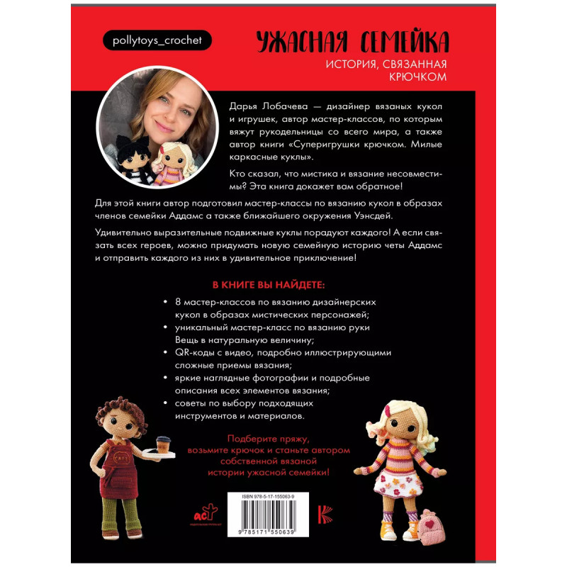 Ужасная семейка. История, связанная крючком. Дарья Лобачева - дизайнер вязаных кукол и игрушек, автор мастер-классов, по которым вяжут рукодельницы со всего мира. Для книги "Ужасная семейка. История, связанная крючком" автор подготовил мастер-классы по вязанию кукол в образах членов семейки Аддамс, а также ближайшего окружения Уэнсдей. В книге вы найдете мастер-классы по вязанию 8 выразительных подвижных дизайнерских кукол в образах мистических персонажей, а также дополнительный мастер-класс по вязанию руки Вещь в натуральную величину. Большая книга с яркими иллюстрациями станет отличным подарком для всех любителей рукоделия, мистики и творчества.