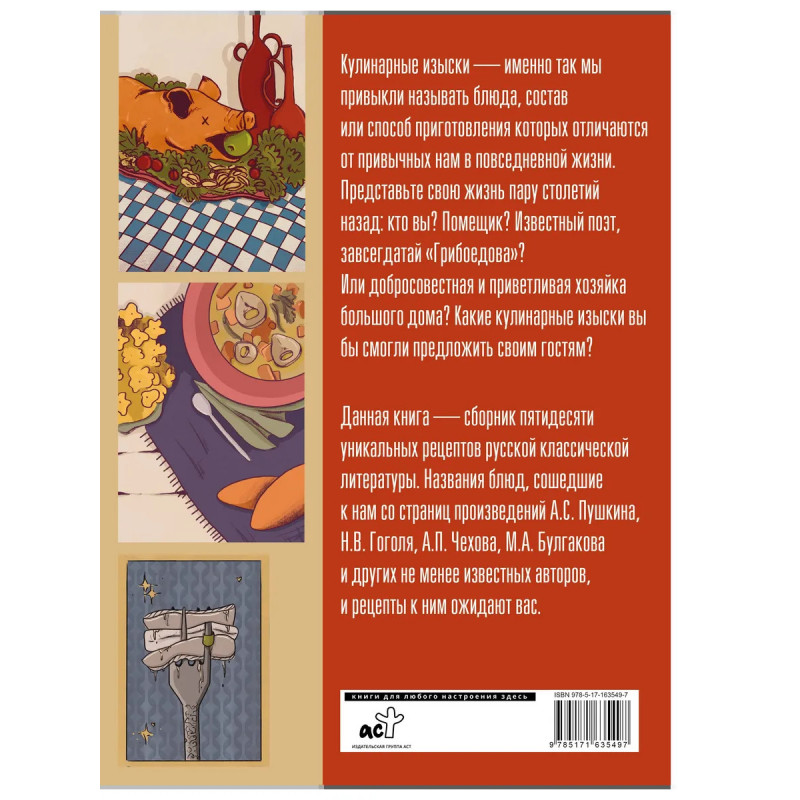 Кулинарные изыски именно так мы привыкли называть блюда, состав или способ приготовления которых отличаются от привычных нам в повседневной жизни. Представьте свою жизнь пару столетий назад: кто вы? Помещик? Известный поэт, завсегдатай Грибоедова? Или добросовестная и приветливая хозяйка большого дома? Какие кулинарные изыски вы бы смогли предложить своим гостям? Данная книга сборник пятидесяти уникальных рецептов русской классической литературы. Названия блюд, сошедшие к нам со страниц произведений А.С. Пушкина, Н.В. Гоголя, А.П. Чехова, М.А. Булгакова и других не менее известных авторов, и рецепты к ним ожидают вас.