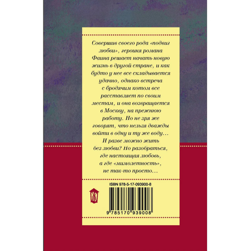 Совершив своего рода "подвиг любви", героиня романа Фаина решает начать новую жизнь в другой стране и как будто у нее все складывается удачно, однако встреча с бродячим котом все расставляет по своим местам, и она возвращается в Москву, на прежнюю работу. Но не зря же говорят, что нельзя дважды войти в одну и ту же воду... И разве можно жить без любви? Но разобраться, где настоящая любовь, а где "мимолетность", не так-то просто...