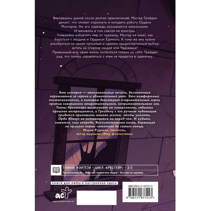Долгожданное продолжение романа Крестейр. Начало, очень полюбившегося читателям! Темное фэнтези в постапокалиптическом мире, разрушенном страшными потусторонними силами. Ради спасения людей Мастер Грейден объединяется с тем, на кого привык охотится. Чем обернется этот союз? Динамичный и эмоционально насыщенный роман, полный жестокости и душераздирающей драмы, заботы и комфорта, веселых и жизнеутверждающих сцен. Яркое оформление с шикарной обложкой, внутренними иллюстрациями и картой на форзацах. Понравится поклонникам романа Шестерка воронов Ли Бардуго.