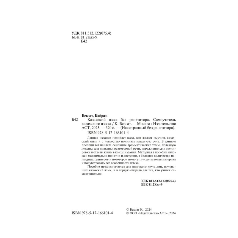 Данное издание подойдет всем, кто желает выучить казахский язык и с легкостью понимать казахскую речь. В данном пособии вы найдете основные грамматические темы, полезную лексику для практики разговорной речи, упражнения для тренировки и ответы к ним в конце издания. Материал в пособии изложен максимально понятно и доступно, а большое количество наглядных примеров и поговорок помогут лучше усвоить материал и почувствовать все особенности языка. Пособие предназначается для широкого круга лиц, изучающих казахский язык, и в первую очередь для тех, кто учится самостоятельно.