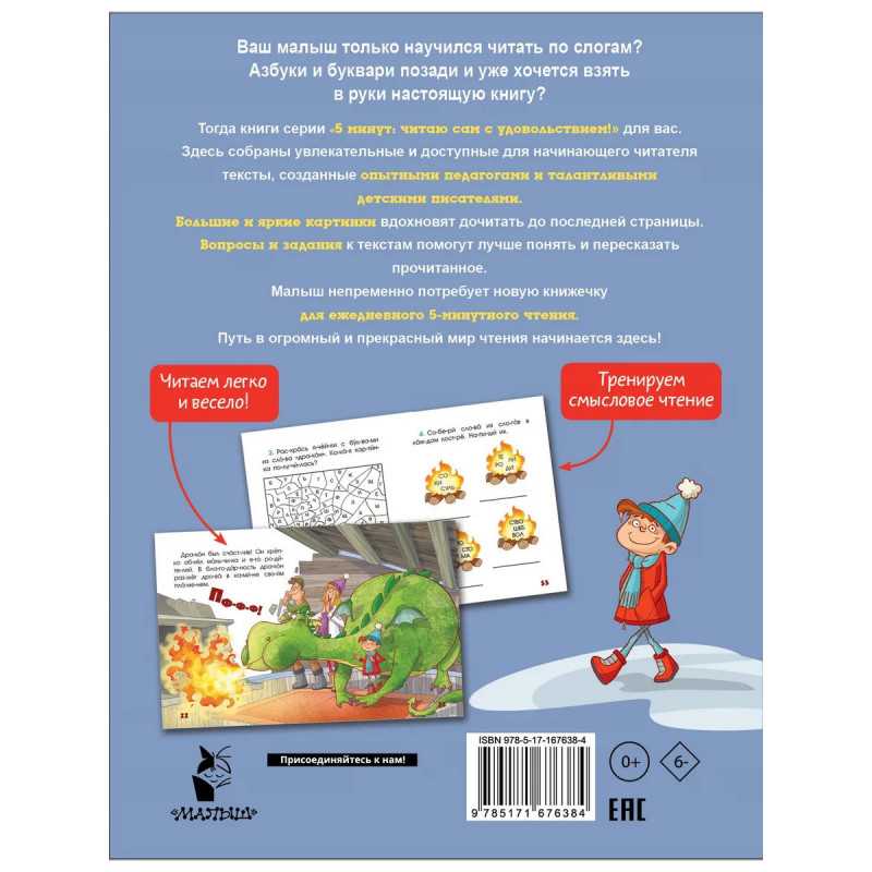 Ваш малыш только научился читать по слогам? Ищите подходящую книгу для первого самостоятельного чтения вашего ребёнка? Книги серии 5 минут: читаю сам с удовольствием! станут лучшим подарком для начинающего читателя. Здесь собраны увлекательные короткие и доступные для малыша тексты, созданные опытными педагогами и талантливыми детскими писателями. Большие и яркие картинки вдохновят дочитать до последней страницы. Вопросы и задания к текстам помогут лучше понять и пересказать прочитанное. Малыш непременно потребует новую книжечку для ежедневного 5-минутного чтения. В этой книге ребята встретятся с настоящим драконом, познакомятся с изобретательной лисой и научатся дружить. Путь в огромный и прекрасный мир чтения начинается здесь!