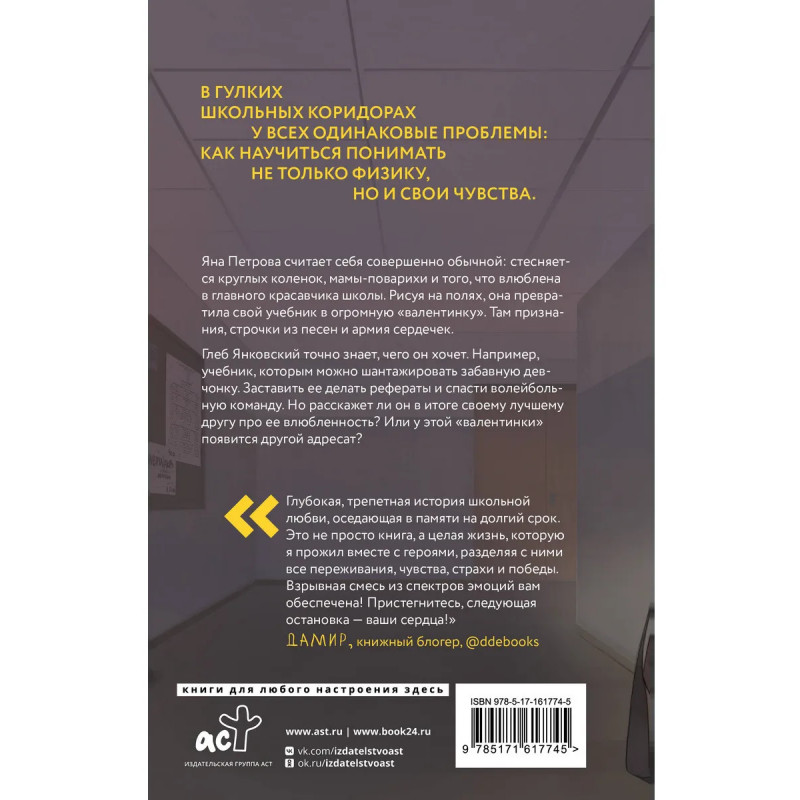 Милая и светлая история о первой школьной влюбленности. Книга открывает Школьное стекло: взгляд на мир через ту особую школьную призму, о которой взрослый говорит: Делаешь из мухи слона. Благодаря мягкой обложке с клапанами книга напоминает дневник на замке. В романе помимо собственно истории много заданий: расшифровать послания, составить плейлист, заполнить бинго Как понять, что ты нравишься парню и анкеты для читателя и его лучшего друга. Для поклонников романов Двойные листочки Натали Марк, 36 вопросов чтобы влюбиться Зины Кузнецовой, книг Ники Сью, Эмилии Грин и Анны Джейн.