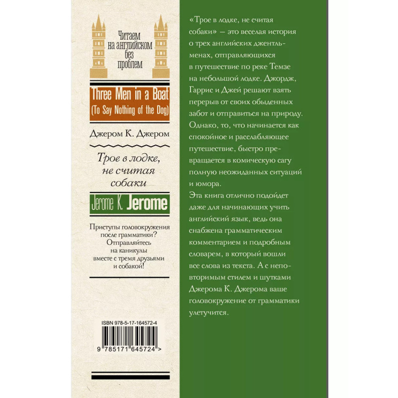 Джером Клапка Джером талантливый английский писатель-сатирик, юморист и драматург. Несмотря на то, что долгие годы его не хотели признавать, он добился своего. В 1885 году к нему пришел успех после публикации юмористической новеллы "На сцене и за сценой". "Трое в лодке, не считая собаки" это веселая история о трех английских джентльменах, отправляющихся в путешествие по реке Темзе на небольшой лодке. Джордж, Гаррис и Джей решают взять перерыв от своих обыденных забот и отправиться на природу. Однако, то, что начинается как спокойное и расслабляющее путешествие, быстро превращается в комическую сагу полную неожиданных ситуаций и юмора. Текст произведения снабжен грамматическим комментарием и словарем. Благодаря этому книга подойдет для всех, кто изучает английский язык.
