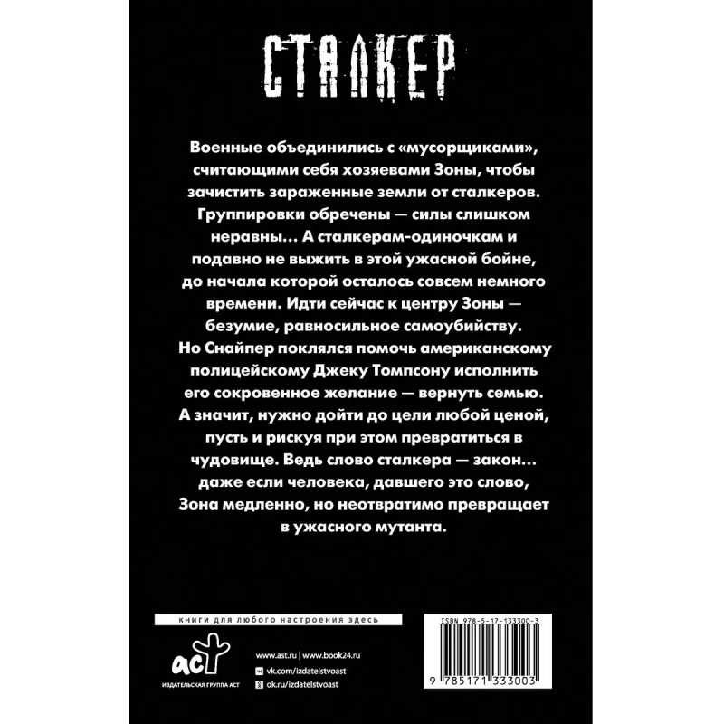 Военные объединились с "мусорщиками", считающими себя хозяевами Зоны, чтобы зачистить зараженные земли от сталкеров. Группировки обречены - силы слишком неравны А сталкерам-одиночкам и подавно не выжить в этой ужасной бойне, до начала которой осталось совсем немного времени. Идти сейчас к центру Зоны - безумие, равносильное самоубийству. Но Снайпер поклялся помочь американскому полицейскому Джеку Томпсону исполнить его сокровенное желание - вернуть семью. А значит нужно дойти до цели любой ценой, даже рискуя при этом превратиться в чудовище. Ведь слово сталкера - закон даже если человека, давшего это слово, Зона медленно, но неотвратимо превращает в ужасного мутанта.