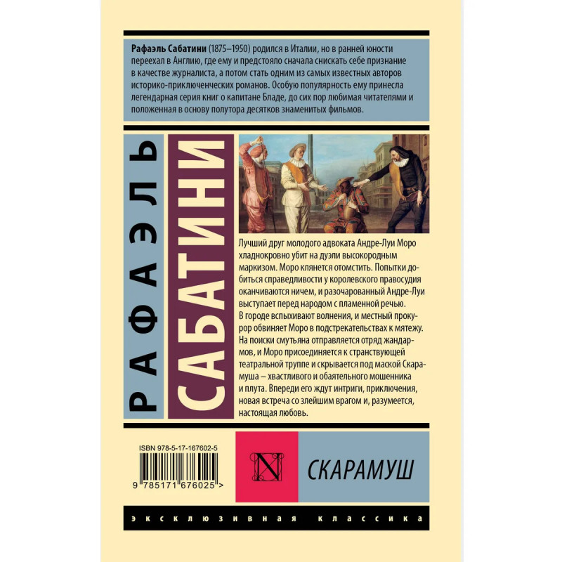 Рафаэль Сабатини известен как один из самых популярных авторов историко-приключенческих романов первой половины XX века. Он написал несколько десятков рассказов и около полусотни романов, среди которых обычно выделяют трилогию о приключениях Питера Блада честного и доблестного английского врача, волею судьбы ставшего пиратом. Однако известность пришла к автору после выхода совсем другого романа Скарамуша, действие которого разворачивается во времена Великой французской революции. Книга стала международным бестселлером, а в 1952 году была экранизирована. Идеально подходит для поклонников таких приключенческих романов как Три мушкетера, Граф Монте-Кристо, Двадцать тысяч лье под водой и Капитан Сорвиголова.