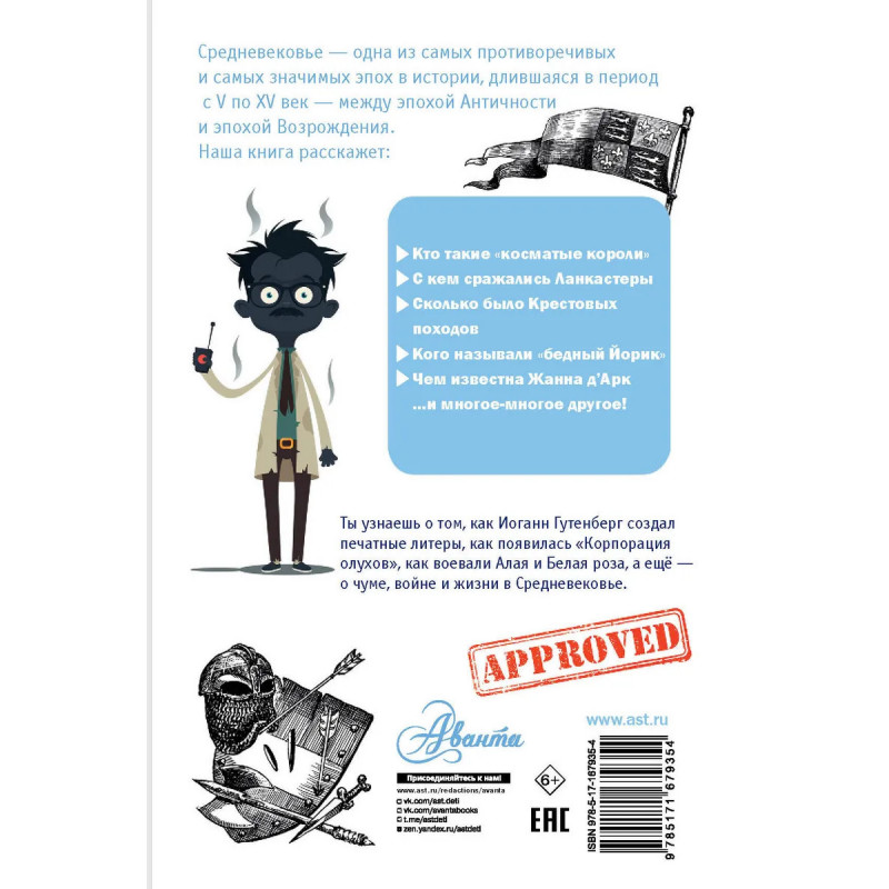 Средневековье одна из самых противоречивых и самых значимых эпох в истории, длившаяся в период с V по XV век. В этот период происходили мрачные события: нашествия варваров, крестовые походы, суды инквизиции, чума Но вместе с тем происходило становление европейских государств и европейской культуры: возникали новые города, учреждались первые университеты, появлялись первые типографии, сделавшие книги доступными для населения, становились популярными театры, карнавалы и маскарады. Одни называют это время самым смутным, другие самым мрачным, третьи уверяют, что это были самые обычные времена. Эта книга поможет читателю расширить представление об эпохе Средних веков, воссоздать картину жизни и главные события того времени. Для среднего школьного возраста.