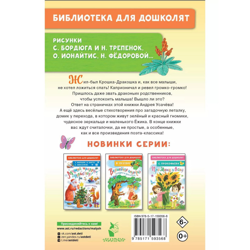 Про Крошку-Дракошку. Веселые стихи. Ж ил-был Крошка-Дракошка и, как все малыши, не хотел ложиться спать! Капризничал и ревел громко-громко! Пришлось даже звать драконьих родственников, чтобы успокоить малыша! Вышло ли это? Ответ на страничках этой книжки Андрея Усачёва! А ещё здесь весёлые стихотворения про загадочную леталку, домик у перехода, в котором живут зелёный и красный гномики, чудесное зеркальце и маленького Ёжика. В конце книжки вас ждут считалочки, да не простые, а особенные, как и все произведения поэта-классика!