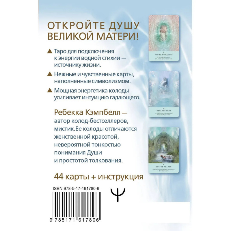 Получите точные ответы на все вопросы вместе с уникальной авторской колодой Таро! Известно, что главный источник жизни на планете это вода. Однако она хранит в себе намного больше, чем мы можем представить. Вода это стихия, наполненная священной целебной энергией и древними знаниями. Колода в ваших руках позволит прикоснуться к ним, заглянуть глубоко внутрь себя и слиться воедино с природой получить доступ к энергиям, которые нас окружают. 44 карты с уникальными и чувственными авторскими иллюстрациями наполнены целебной энергетикой и вибрациями, которые позволят вам погрузиться в глубины внутреннего мира. Каждая карта наполнена вдохновляющими аффирмациями вопросами, которые позволят направить мысли и энергию в нужный поток, чтобы найти точки соприкосновения с внутренним "я". Гадайте, медитируйте и задавайте самые сокровенные вопросы ответы не заставят себя ждать. Колода подойдёт как новичкам, так и профессионалам. Комплект состоит из 44 карт и инструкции.
