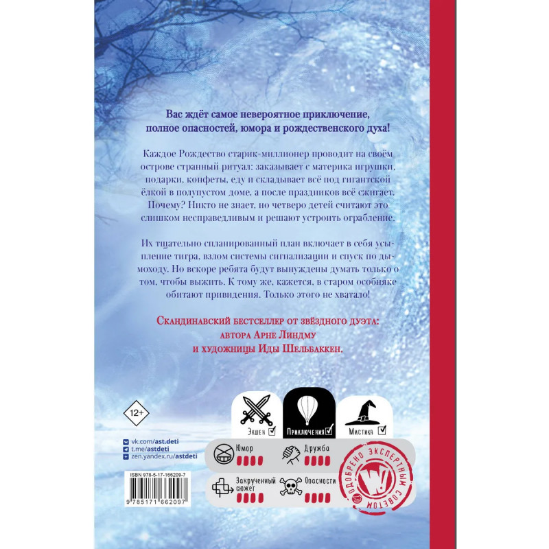 Каждое рождество старик-миллионер проводит на своём острове странный ритуал: заказывает с материка игрушки, подарки, конфеты, еду и складывает всё под гигантской ёлкой в полупустом доме, а после праздников всё сжигает. Почему? Никто не знает, но четверо детей считают это слишком несправедливым и решают устроить ограбление. Их тщательно спланированный план включает в себя усыпление тигра, взлом системы сигнализации и спуск по дымоходу. Но вскоре ребята будут вынуждены думать только о том, чтобы выжить. К тому же, кажется, в старом особняке обитают привидения. Только этого не хватало! Вас ждёт самое невероятное приключение, полное опасностей, юмора и рождественского духа! Норвежский бестселлер от звёздного дуэта Арне Линдму и Иды Шельбаккен.