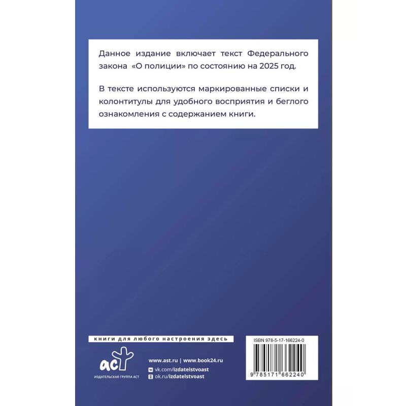 Данное издание включает текст Федерального закона "О полиции" на 2025 год. В тексте используются маркированные списки и колонтитулы для удобного восприятия и беглого ознакомления с содержанием книги. Издание учитывает все изменения, опубликованные в официальных источниках на момент подписания издания в печать.