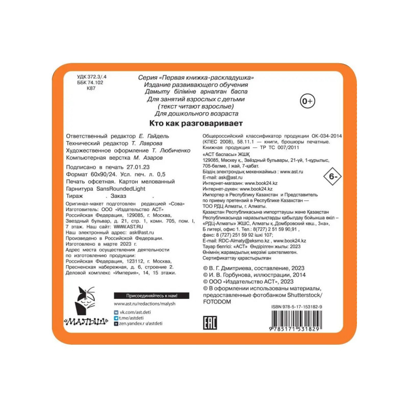 Кто как разговаривает весёлая книжка-гармошка для самых маленьких и любознательных ребятишек. На красочных страницах малыши найдут яркие картинки разных животных и узнают, какие звуки они издают. Занятия с такими книжками развивают речь, воображение, фантазию, мышление и мелкую моторику ребёнка. Завладеть вниманием малыша и превратить занятие в весёлую игру родителям поможет увлекательная серия Первая книжка-раскладушка. Это замечательные книжки с яркими картинками для самых любознательных малышей! А заниматься по ярким иллюстрациям в стиле современных мультфильмов легко и приятно!