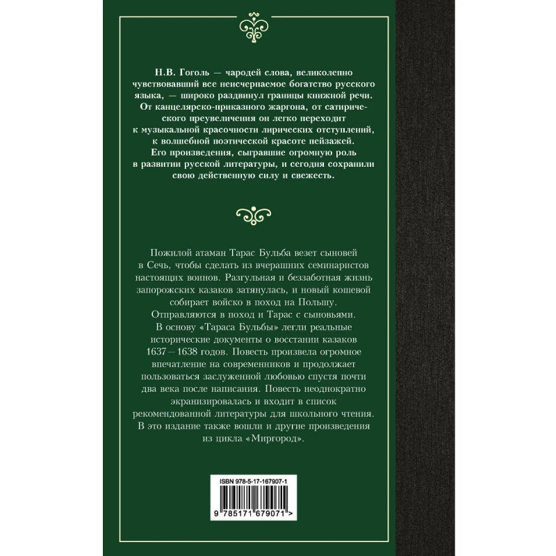 Тарас Бульба одно из самых известных произведений Николая Гоголя. В основу повести легли реальные исторические документы о восстании запорожских казаков 1637-1638 годов. Повесть произвела неизгладимое впечатление на современников и продолжает пользоваться заслуженной любовью читателей и спустя почти два века с момента написания. Тарас Бульба переведен на десять иностранных языков. Повесть многократно адаптировалась для театральной и оперной сцены и удостоилась более десяти экранизаций, последняя на сегодняшний день, с Богданом Ступкой в главной роли, вышла в 2009 году. Повесть Тарас Бульба входит в список рекомендованной литературы для школьного чтения. В данное издание вошли и другие произведения из цикла Миргород.