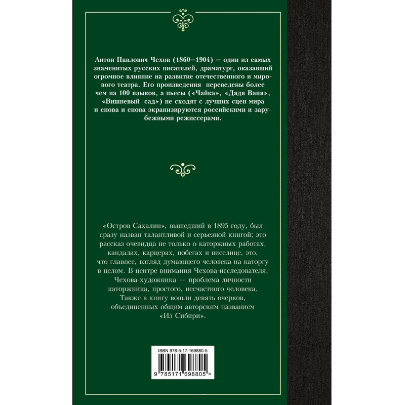 Писатель, публицист и драматург Антон Павлович Чехов признанный классик мировой литературы и один из самых значимых русских литераторов второй половины XIX века, автор знаменитых пьес Дядя Ваня, Вишневый сад, Три сестры и Чайка, создатель Палаты №6 и Человека в футляре. Вышедший в 1895 году Остров Сахалин это сборник путевых заметок о совершенной писателем поездке на остров Сахалин. Впрочем, центральное место в книге занимают впечатления от увиденных писателем каторг и каторжан. Также в данное издание вошел сборник авторских очерков Из Сибири.