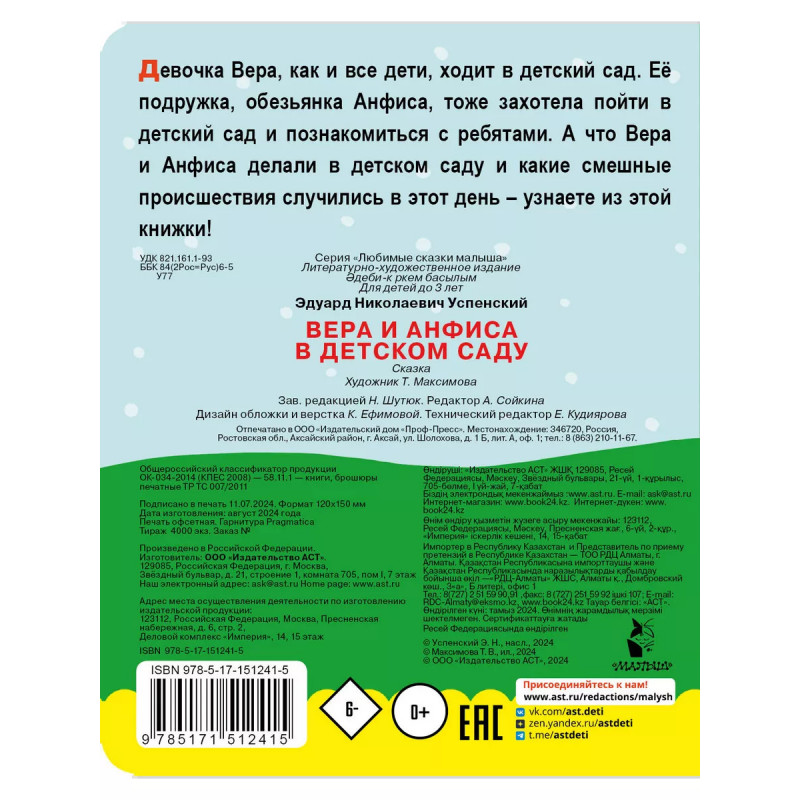 Девочка Вера, как и все дети, ходит в детский сад. Её подружка, обезьянка Анфиса, тоже захотела пойти в детский сад и познакомиться с ребятами. А что Вера и Анфиса делали в детском саду и какие смешные происшествия случились в этот день узнаете из этой книжки! Эдуард Николаевич Успенский - классик отечественной детской литературы. Его истории про девочку Веру и обезьянку Анфису очень нравятся маленьким читателям, ведь они смешные, динамичные и интересные. В этой книге текст дополнен иллюстрациями современной художницы Татьяны Максимовой. Эта книга предназначена именно для малышей: в ней яркие рисунки и крупные буквы, плотный картон не порвется при чтении, а скругленные уголки не повредят маленькие пальчики.