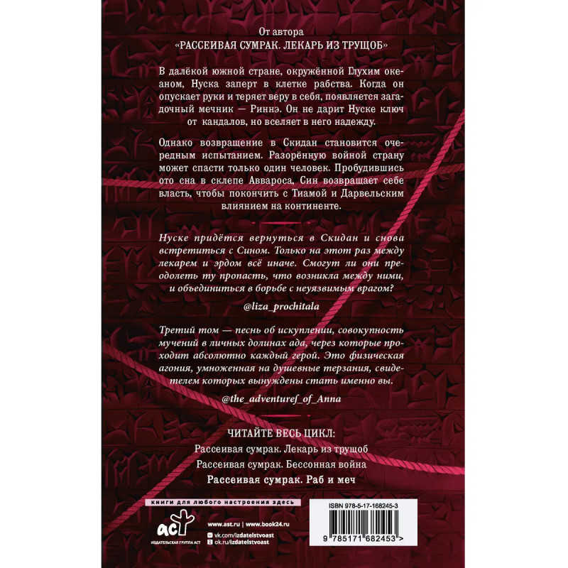 Третья часть цикла-бестселлера Рассеивая сумрак. Фэнтези о лекаре из трущоб, попавшем в круг мага-правителя и эпицентр дворцовых интриг. Карты на форзацах и черно-белые иллюстрации внутри. Затягивающий сюжет, динамичное повествование, крышесносный броманс и атмосфера азиатских новелл. Понравится фанатам романов Благословение небожителей и Магистр дьявольского культа Мосян Тунсю.