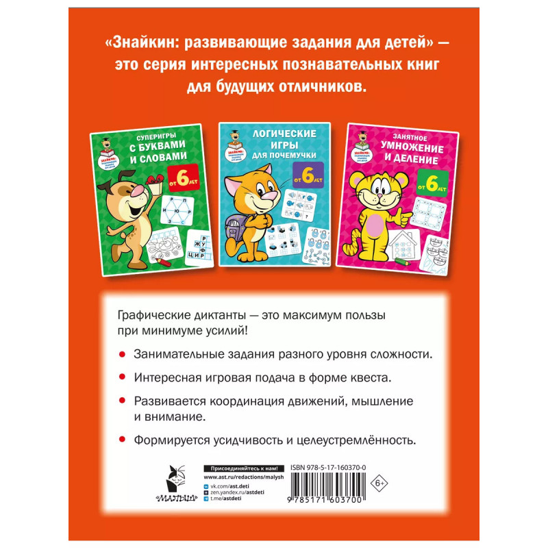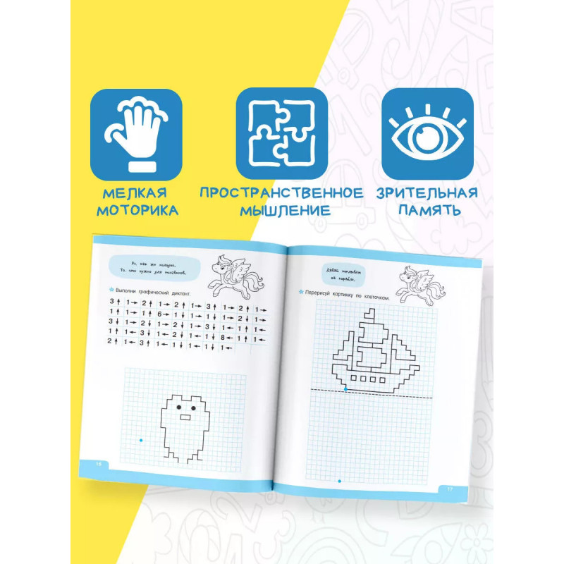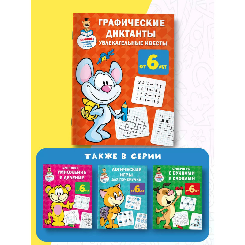 Чем полезны графические диктанты? Они формируют точность движений, улучшают ориентацию в пространстве, учат концентрировать внимание, тренируют абстрактное мышление и воображение. Ребёнок становится более усидчивым и целеустремлённым. Он спокойнее реагирует на трудности, быстрее решает любые повседневные задачи и лучше справляется со стрессом. Огромная польза при минимуме усилий ведь потребуются всего-навсего карандаш и листок в клеточку! Умный тренажёр Графические диктанты: увлекательные квесты предлагает задания разных уровней сложности, объединённые занимательным сюжетом.