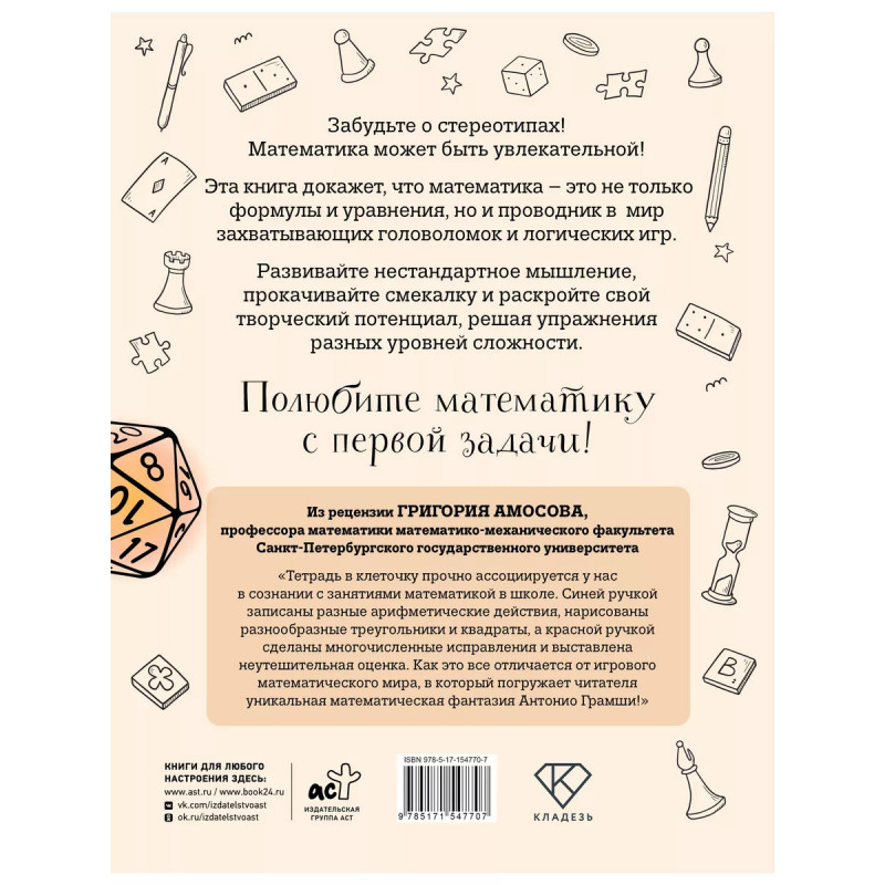 Забудьте о стереотипах! Математика может быть увлекательной! Эта книга докажет, что математика это не только формулы и уравнения, но и проводник в мир захватывающих головоломок и логических игр. Развивайте нестандартное мышление, прокачивайте смекалку и раскройте свой творческий потенциал, решая упражнения разных уровней сложности. Полюбите математику с первой задачи!