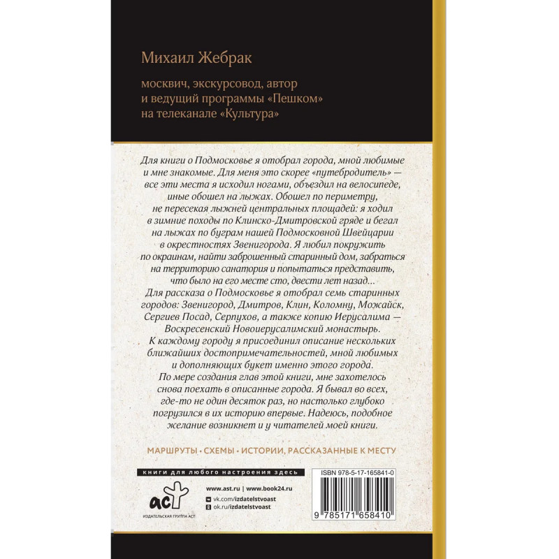 Михаил Жебрак москвич, экскурсовод, автор и ведущий программы Пешком на телеканале Культура. Предлагаем вам вместе с автором этого путеводителя прогуляться по Подмосковью. Московская область богата историко-культурными памятниками и природными достопримечательностями. Здесь сосредоточено много старинных посадов, которые играли заметную роль в истории России, здесь уцелели некоторые усадьбы и имения. Для книги о Подмосковье автор отобрал неоднократно посещаемые, любимые и самые интересные места. Семь старинных городов: Коломну, Серпухов, Можайск, Звенигород, Клин, Дмитров, Сергиев Посад и копию Иерусалима Воскресенский Новоиерусалимский монастырь. Читайте об архитектурных шедеврах и узнавайте занимательные истории о знаменитых жителях, рассматривайте фотографии. Надеемся, это побудит вас совершить прогулку. Для удобства в начале глав представлены схемы городов.