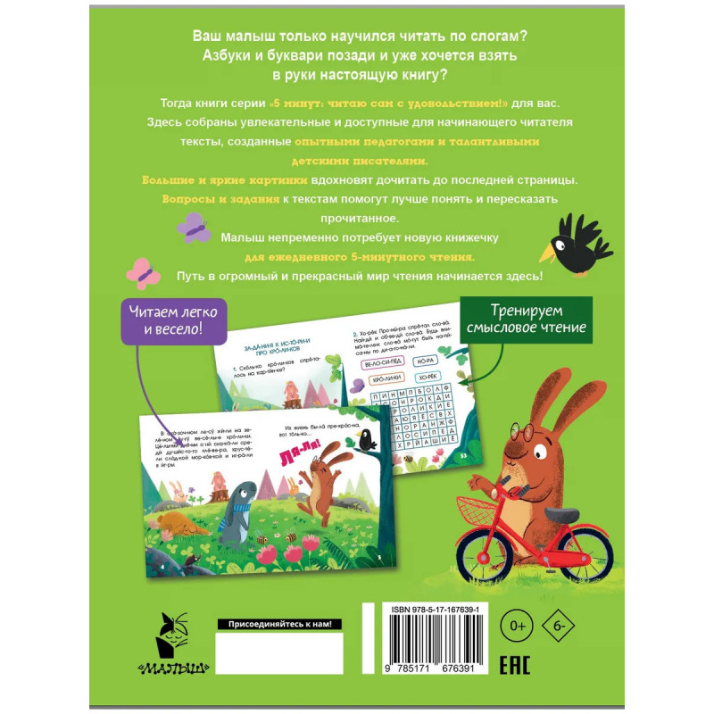 Ваш малыш учиться читать? Азбуки и буквари остались позади, но вы не знаете, что подобрать для первого чтения? Тогда книги серии 5 минут: читаю сам с удовольствием! для вас. Здесь собраны короткие, увлекательные и доступные для начинающего читателя тексты, созданные опытными педагогами и талантливыми детскими писателями. Вопросы и задания к текстам помогут лучше понять и пересказать прочитанное Большие и яркие картинки вдохновят дочитать до последней страницы. Малыш непременно потребует новую книжечку для ежедневного 5-минутного чтения. В этой книге малыши познакомятся с изобретательными кроликами и примут участие в необычном концерте, научатся доброте и храбрости. Отличный подарок для вашего сына или дочки. Путь в огромный и прекрасный мир чтения начинается здесь!
