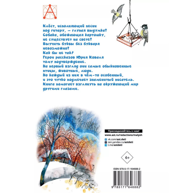 Клёст, исполняющий песни под гитару, - глупая выдумка? Собака, обожающая картошку, не существует на свете? Выучить буквы в осенней грязи невозможно? Как бы не так! Герои рассказов Юрия Коваля тому подтверждение. На первый взгляд они самые обыкновенные птицы, животные, люди. Но каждый из них в чём-то особенный, и это чутко подмечает знаменитый писатель. Книга помогает взглянуть на окружающий мир другими глазами.