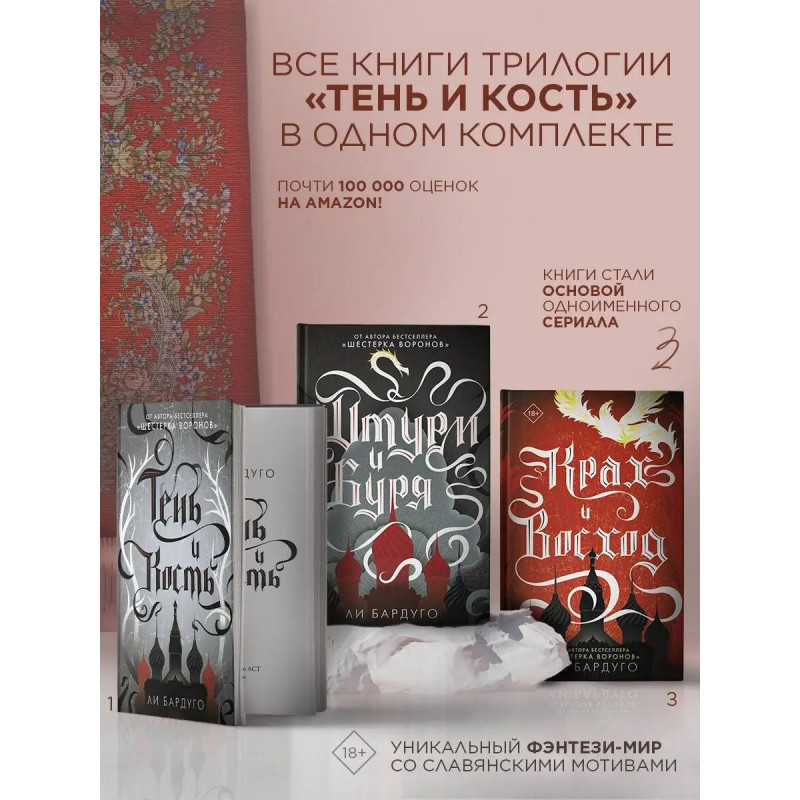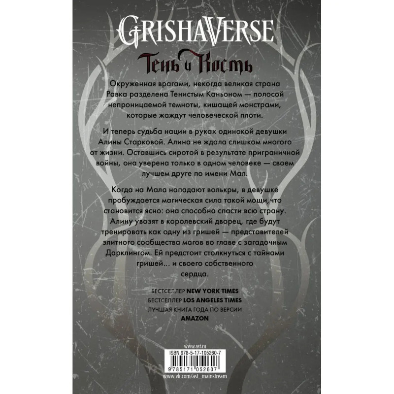Тень и кость - дебютный роман Ли Бардуго, автора бестселлеров Шестерка воронов и Продажное королевство. Книга, с которой началась история гришй - людей с магическими способностями. Алина Старкова - семнадцатилетняя девушка-сирота, которую отправили на войну в приграничную зону. Она знает, что, возможно, не переживет свой первый бой. Но дороже жизни ей Мал - ее единственный друг, которого она боится потерять. Когда на них нападают волькры - монстры, враждебные порождения тьмы, - Алина неожиданно открывает в себе силу, о которой не подозревала. Магия Алины так сильна, что становится ясно: она способна спасти всю страну. Алину увозят в королевский дворец, где будут тренировать как одну из гришей - представителей элитного сообщества магов во главе с загадочным Дарклингом. Ей предстоит столкнуться с тайнами гришей и своего собственного сердца. Книга вошла в список бестселлеров New York Times и Los Angeles Times; права на ее экранизацию приобрел продюсер Дэвид Хейман - человек, благодаря которому увидели