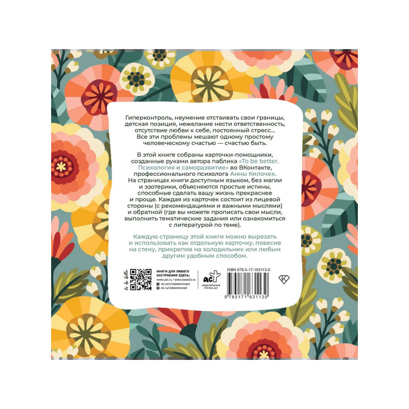 Гиперконтроль, неумение отстаивать свои границы, детская позиция, нежелание нести ответственность, отсутствие любви к себе, постоянный стресс... Все эти проблемы мешают одному простому человеческому счастью счастью быть. В этой книге собраны карточки-помощники, созданные руками автора паблика "To be better. Психология и саморазвитие" во ВКонтакте, профессионального психолога Анны Килочек. На страницах книги доступным языком, без магии и эзотерики, объясняются простые истины, способные сделать вашу жизнь прекраснее и проще. Каждая из карточек состоит из лицевой стороны (с рекомендациями и важными мыслями) и обратной (где вы можете прописать свои мысли, выполнить тематические задания или ознакомиться с литературой по теме).