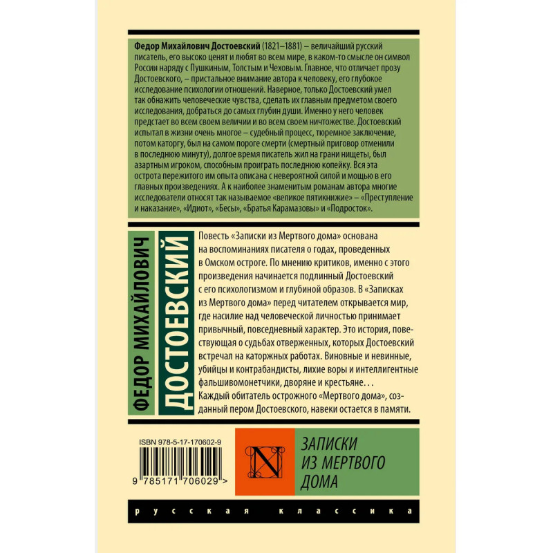 Классика русской литературы. От автора знаменитых романов Преступление и наказание, Идиот и Бесы. Федор Михайлович Достоевский один из самых величайших русских писателей. Основанная на воспоминаниях о времени, проведенном на каторге в Омском остроге, повесть считается тем самым произведением, с которого начался подлинный Достоевский с его психологизмом и глубиной образов. Любимая книга теперь в узнаваемом оформлении серии Эксклюзивная классика и в твердой обложке.