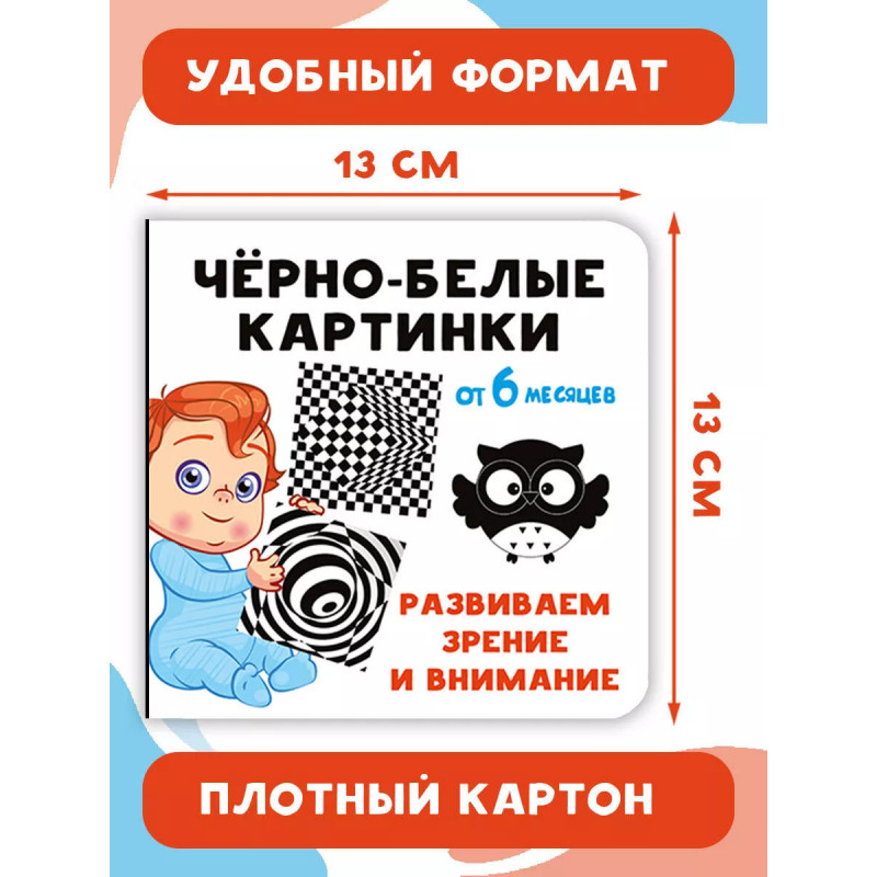 Знаете ли вы, как видит мир ваш новорождённый ребёнок? В поле его зрения - лишь серые размытые изображения и неясные силуэты. Малышу предстоит пройти долгий путь, прежде чем он научится фокусировать взгляд, воспринимать предметы объёмно, лучше ориентироваться в пространстве, подмечать детали, концентрировать внимание. Давайте поможем ему! Наша книга "Чёрно-белые картинки. Развиваем зрение и внимание с 6 месяцев" не только стимулирует остроту зрения младенца, но и положительно сказывается на его общем развитии. Книга безопасна и долговечна: у неё закруглённые края страниц из плотного картона.
