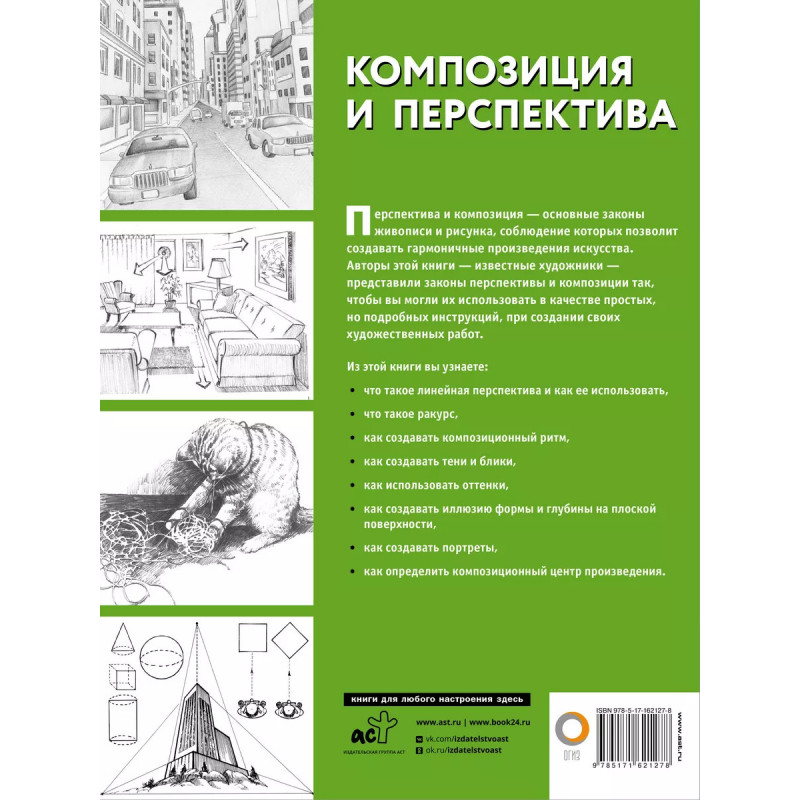 Композиция и перспектива. Книга адресована всем, кто желает в совершенстве овладеть "основами основ" изобразительного искусства - традиционными и современными приемами построения перспективы и композиции. Перспектива и композиция - основные законы живописи и рисунка, включающие в себя множество приемов и хитростей, соблюдение которых позволит создавать гармоничное произведение искусства. Авторы этой книги - известные художники, представили законы перспективы и композиции так, чтобы вы могли их использовать в качестве простых, но подробных инструкций при создании своих произведений. Овладев этими знаниями даже начинающий художник сможет добиться любой степени реализма.