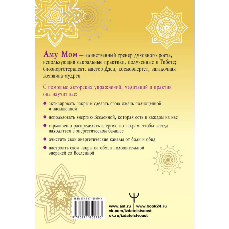 Аму Мом единственный тренер духовного роста, использующий сакральные практики, полученные в Тибете; биоэнерготерапевт, мастер Дзен, космоэнергет. Чакры это энергетические центры, работа которых влияет на эмоциональное и физическое здоровье человека, гармонию и состояние сознания. Чакры принимают, накапливают и преобразуют энергию Вселенной. Учение о чакрах известно людям уже множество столетий, но только избранные обладают секретными приемами и способами работы с чакрами. В книге вы найдете Знание Мастера: самые эффективные упражнения и медитации, которые отточены многолетней практикой и глубинными знаниями о чакрах и энергиях. Тайные техники помогут вам усилить поток Силы Вселенной и научат использовать ее во благо. В результате работы вы получите открытые, наполненные, сбалансированные чакры, способные исцелить не только физическое тело, но и ментальное, избавив от болезней, страданий, страхов, невезения, негатива.