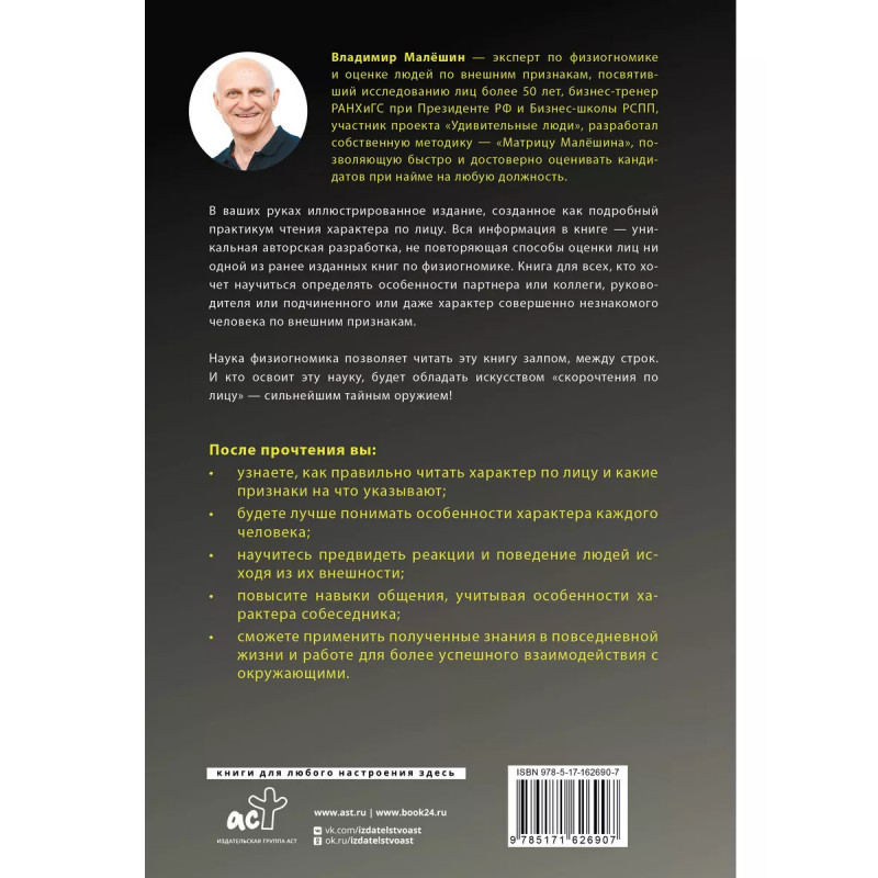 Владимир Малёшин эксперт по физиогномике и оценке людей по внешним признакам, посвятивший исследованию лиц более 50 лет, бизнес-тренер РАНХиГС при Президенте РФ и Бизнес-школы РСПП, участник проекта "Удивительные люди", разработал собственную методику "Матрицу Малёшина", позволяющую быстро и достоверно оценивать кандидатов при найме на любую должность. В ваших руках иллюстрированное издание, созданное как подробный практикум чтения характера по лицу. Вся информация в книге уникальная авторская разработка, не повторяющая способы оценки лиц ни одной из ранее изданных книг по физиогномике. Книга для всех, кто хочет научиться определять особенности партнера или коллеги, руководителя или подчиненного или даже характер совершенно незнакомого человека по внешним признакам. Наука физиогномика позволяет читать эту книгу залпом, между строк. И кто освоит эту науку, будет обладать искусством "скорочтения по лицу" сильнейшим тайным оружием!