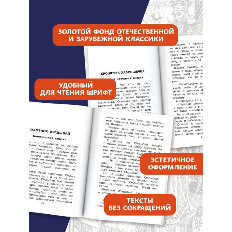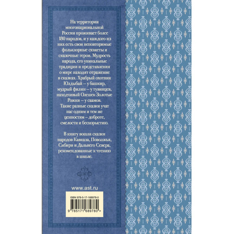 На территории многонациональной России проживает более 180 народов, и у каждого из них есть свои неповторимые фольклорные сюжеты и сказочные герои. Мудрость народа, его уникальные традиции и представления о мире находят отражение в сказках. Храбрый охотник Юлдыбай у башкир, мудрый филин у тувинцев, находчивый Олешек Золотые Рожки у саамов. Такие разные сказки учат нас одним и тем же ценностям доброте, смелости и бескорыстию. В книгу вошли сказки народов Кавказа, Поволжья, Сибири и Дальнего Севера, рекомендованные к чтению в школе.