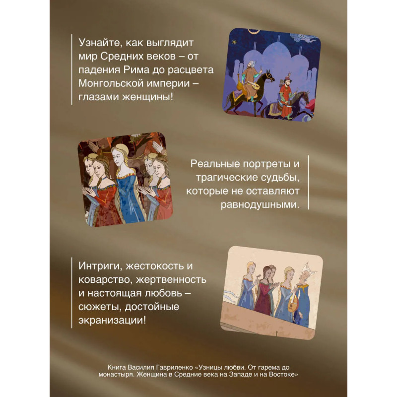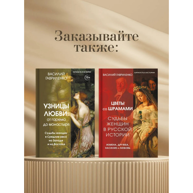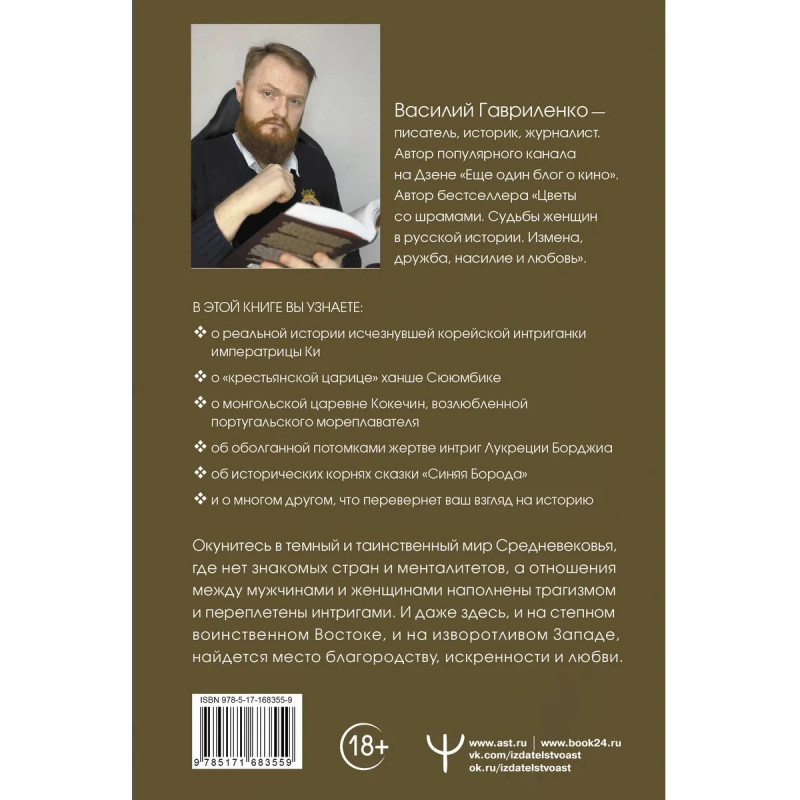 Всесокрушающая любовь и роковая страсть, разрушающая ревность и бесконечная жертвенность та часть истории, о которой мы мало знаем, и та ее сторона, где правили женщины. Василий Гавриленко, писатель и журналист, автор бестселлера "Цветы со шрамами. Судьбы женщин в русской истории. Измена, дружба, насилие и любовь" представляет вторую книгу о трудной судьбе женщин в истории. На этот раз автор погрузит читателя в полумифический мир Средних веков от эпохи после падения Рима до расцвета Монгольской империи. Вас ждут захватывающие и трагические истории о ханских наложницах, прекрасных дамах, их не всегда благородных рыцарях, о восточных правительницах, придворных интригах, жестоких перипетиях, легших в основу страшных сказок и легенд.