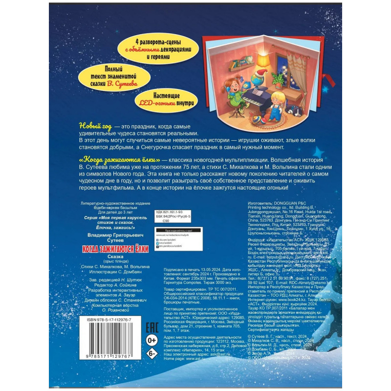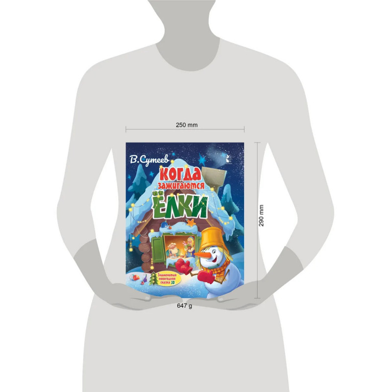 Перед вами не просто книга, а настоящий набор для увлекательной новогодней игры! 4 объемные сцены из любимого мультфильма с настоящими светодиодными огоньками внутри позволят разыграть свое собственное представление и оживить героев сказки. К книге прилагается подарок книжка-игрушка с текстом сценария В. Г. Сутеева, которую после чтения можно повесить на ёлку! "Когда зажигаются ёлки" классика новогодней мультипликации. Волшебная история В. Сутеева любима уже на протяжении 75 лет, а стихи С. Михалкова и М. Вольпина стали одним из символов Нового года. Эта книга с иллюстрациями современного художника-мультипликатора Сусанны Домбаян не только расскажет новому поколению читателей о самом чудесном дне в году, но и позволит разыграть своё собственное представление и оживить героев мультфильма. А в конце истории на ёлочке зажгутся настоящие огоньки!