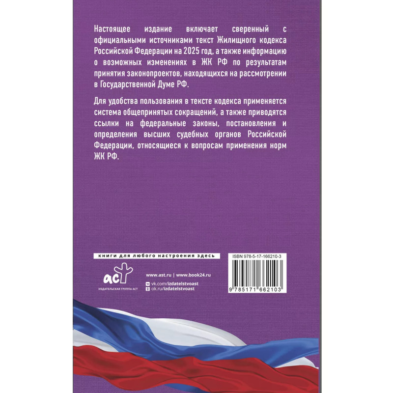 Данное издание Жилищного кодекса РФ сверено с официальным источником и приводится по состоянию на 2025 год. Кодекс учитывает все изменения, опубликованные в официальных источниках на момент подписания издания в печать. В издании представлена информация о возможных изменениях в ЖК РФ по результатам принятия законопроектов, находящихся на рассмотрении в Государственной Думе РФ. Для удобства пользования в тексте кодекса применяется система общепринятых сокращений, а также приводятся ссылки на федеральные законы, постановления Правительства Российской Федерации, постановления и определения высших судебных органов Российской Федерации, относящиеся к вопросам применения норм ЖК РФ.