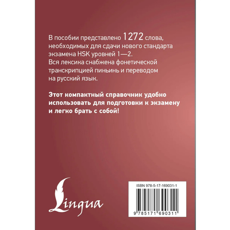 В этом пособии представлен список лексики, необходимой для сдачи международного экзамена HSK версии 3.0. Словарь разделен на две части в соответствии с уровнями экзамена: часть с лексикой HSK 1, включающая 500 слов, и часть с лексикой HSK 2, включающая 772 слова. Ко всем словам приводится перевод и транскрипция пиньинь. Словарь подойдет всем, кто изучает китайский язык.
