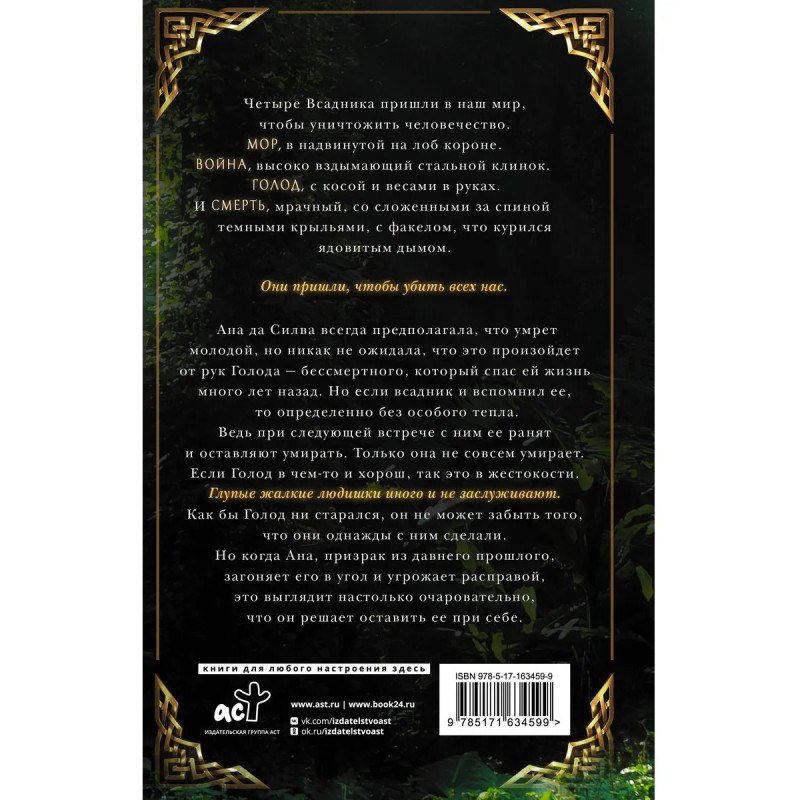Долгожданная третья часть цикла Всадники Апокалипсиса. Непредсказуемые сюжетные ходы. Мрачный мир с большей жестокостью, чем в предыдущих частях, и реалистичными серьезными ситуациями. Эмоционально насыщенная любовная линия в стиле слоу-бёрн с яркой химией между героями и тропом от врагов к возлюбленным. Издание в оригинальной обложке. Понравится поклонникам темного фэнтези и миров Пенелопы Дуглас, Дженнифер Арментроут, Кэрри Манискалко.