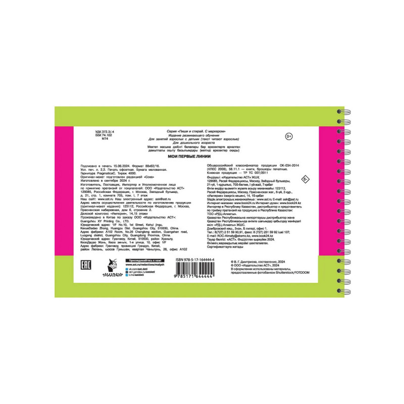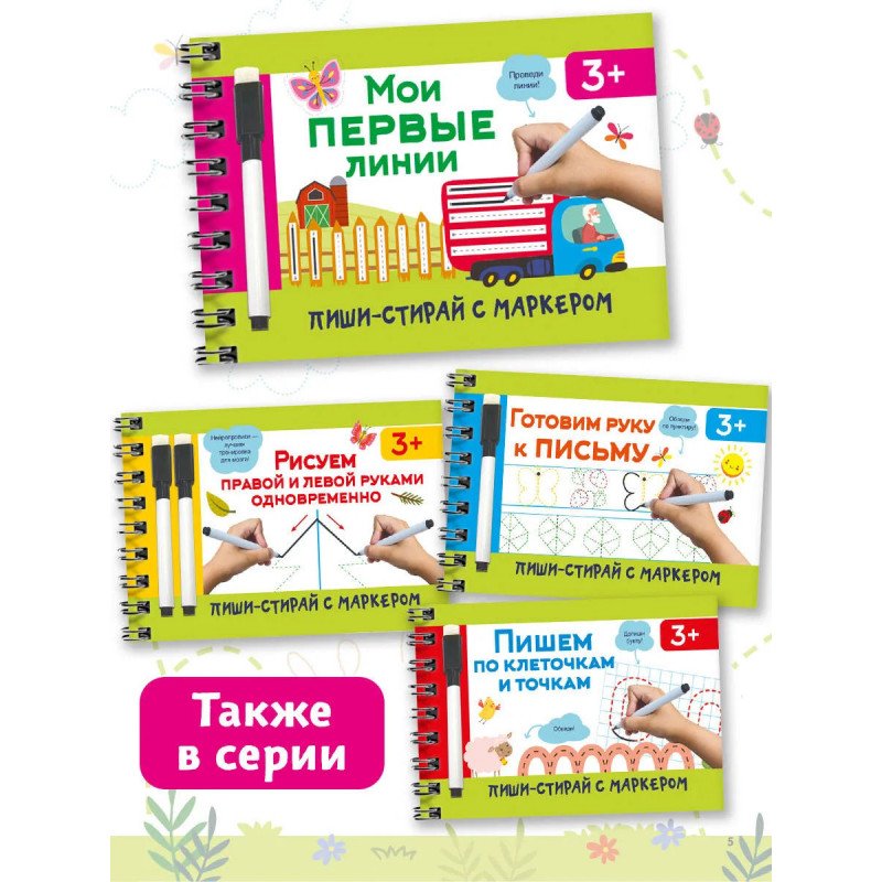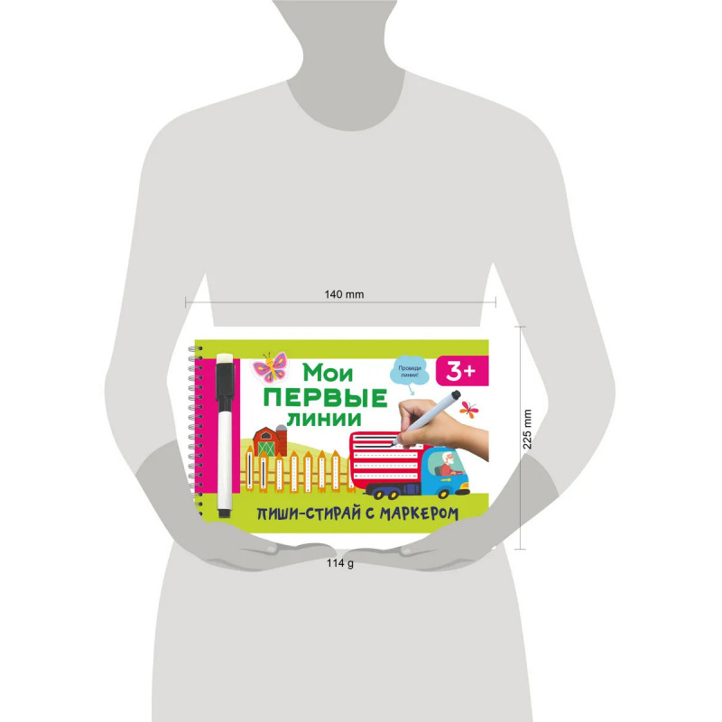 "Мои первые линии" удобный и полезный многоразовый блокнот на спирали, в котором можно писать, рисовать и стирать хоть 100 раз! Крупные понятные картинки и разнообразные задания для тренировки мелкой моторики, мышления, внимания, координации, речи это идеальный вариант для детей 1-3 лет. Плотная мелованная бумага и глянцевые ламинированные страницы делают книгу не только привлекательной, но и долговечной. В комплекте маркер на водной основе. Книгу можно использовать дома, на занятиях в младших группах детского сада и даже в дороге.Для дошкольного возраста.