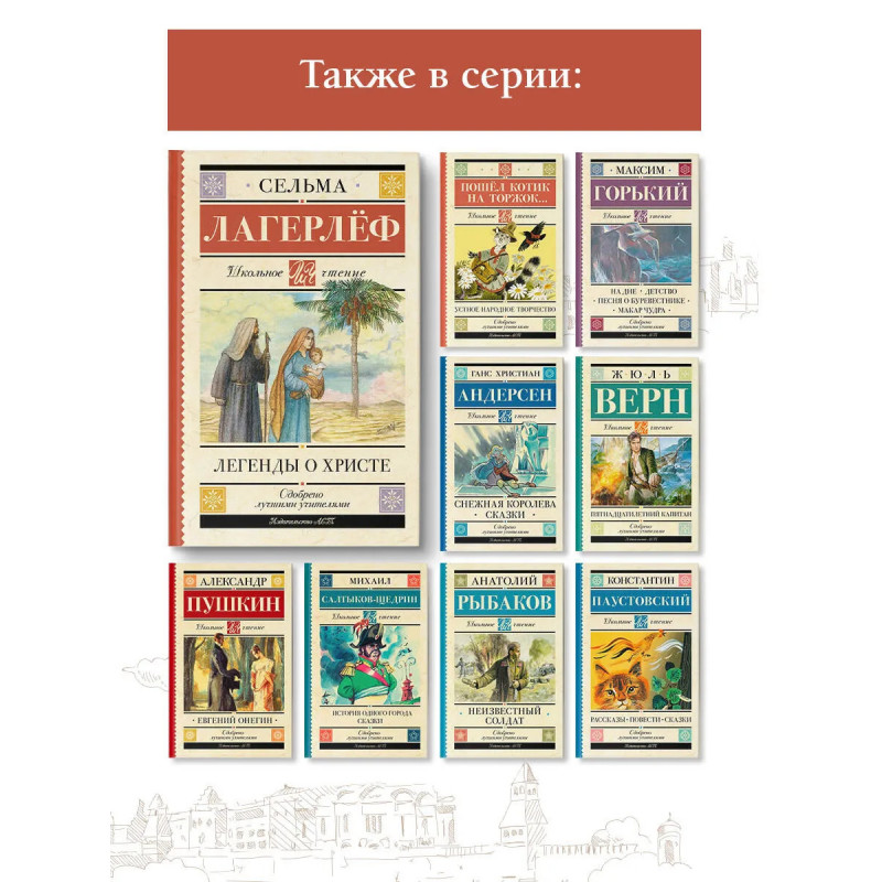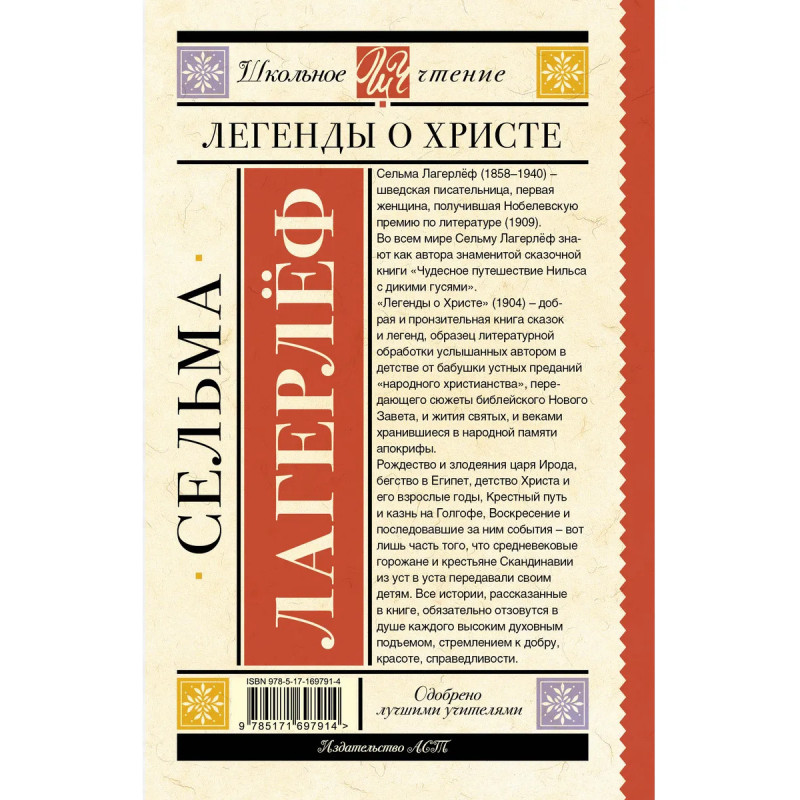 Сельма Лагерлёф (18581940) шведская писательница, первая женщина, получившая Нобелевскую премию по литературе (1909). Во всем мире Сельму Лагерлёф знают, как автора знаменитой сказочной книги "Чудесное путешествие Нильса с дикими гусями". "Легенды о Христе" (19094) добрая и пронзительная книга сказок и легенд образец литературной обработки услышанных автором в детстве от бабушки устных преданий "народного христианства", передающего сюжеты библейского Нового Завета, и жития святых, и веками хранившиеся в народной памяти апокрифы. Рождество и злодеяния царя Ирода, бегство в Египет, детство Христа и его взрослые годы, Крестный путь и казнь на Голгофе, Воскресение и последовавшие за ним события вот лишь часть того, что средневековые горожане и крестьяне Скандинавии из уст в уста передавали своим детям. Все истории, рассказанные в книге, обязательно отзовутся в душе каждого высоким духовным подъемом, стремлением к добру, красоте, справедливости.
