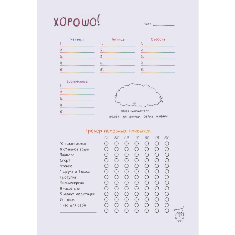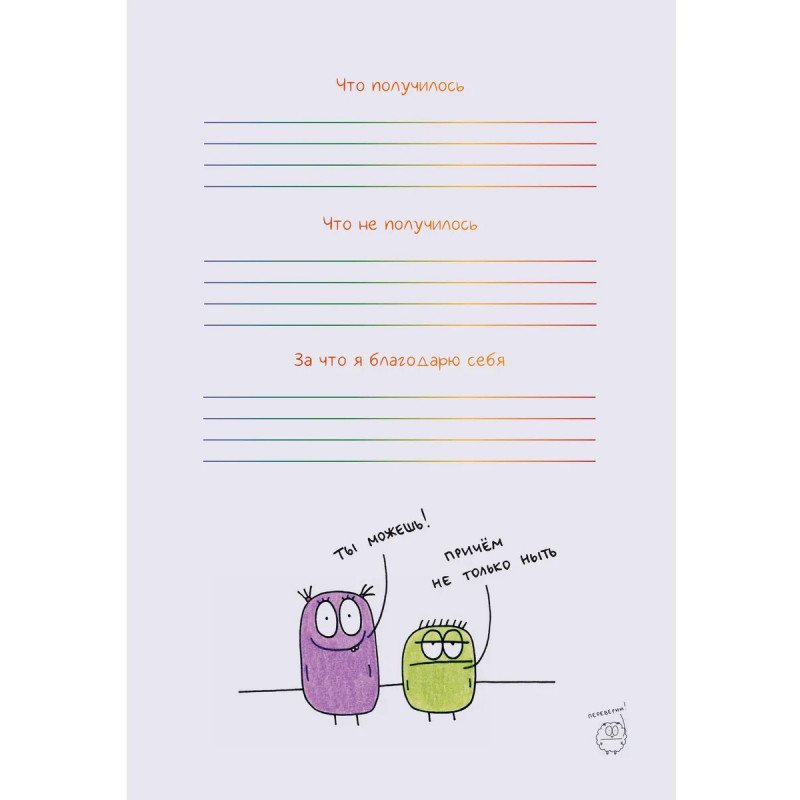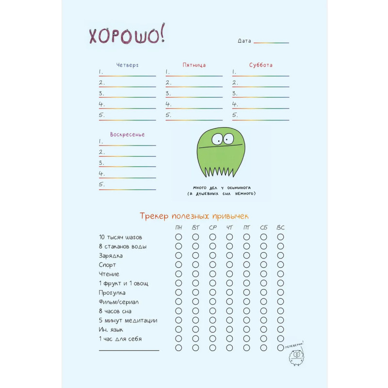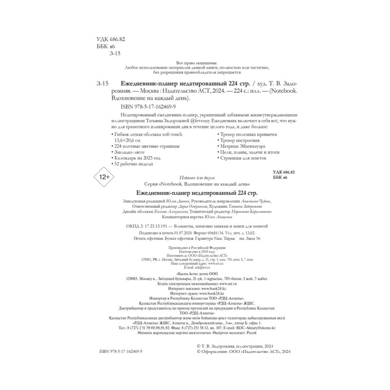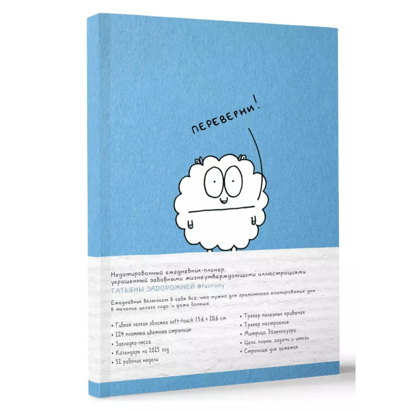 Недатированный ежедневник-планер, украшенный забавными жизнеутверждающими иллюстрациями Татьяны Задорожней @fevrony. Ежедневник включает в себя всё, что нужно для грамотного планирования дня в течение целого года, и даже больше: Гибкая легкая обложка soft-touch 13,620,6 см 224 плотные цветные страницы Закладка-ляссе Календарь на 2025 год 52 рабочие недели Трекер полезных привычек Трекер настроения Матрица Эйзенхауэра Цели, планы, задачи и итоги Страницы для заметок