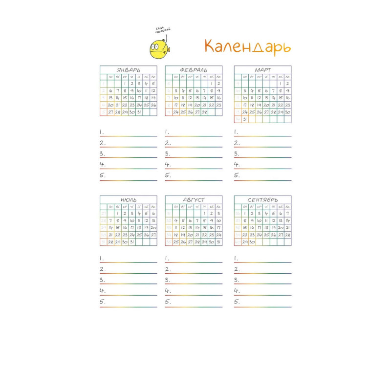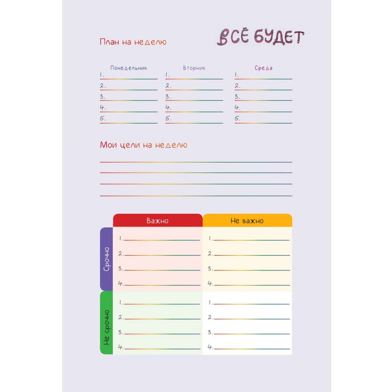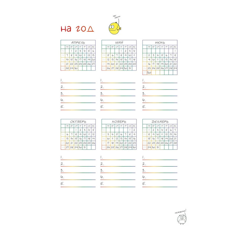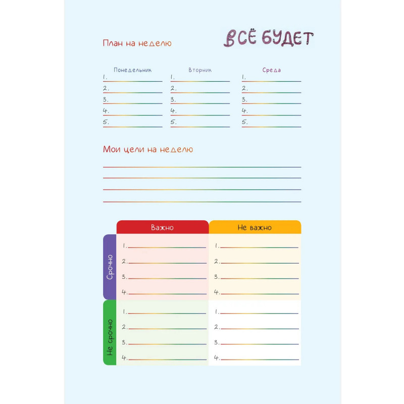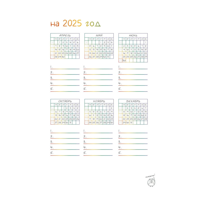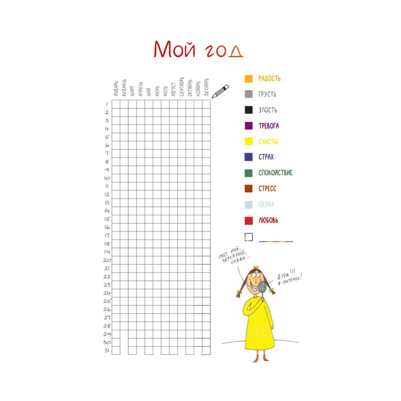 Недатированный ежедневник-планер, украшенный забавными жизнеутверждающими иллюстрациями Татьяны Задорожней @fevrony. Ежедневник включает в себя всё, что нужно для грамотного планирования дня в течение целого года, и даже больше: Гибкая легкая обложка soft-touch 13,620,6 см 224 плотные цветные страницы Закладка-ляссе Календарь на 2025 год 52 рабочие недели Трекер полезных привычек Трекер настроения Матрица Эйзенхауэра Цели, планы, задачи и итоги Страницы для заметок