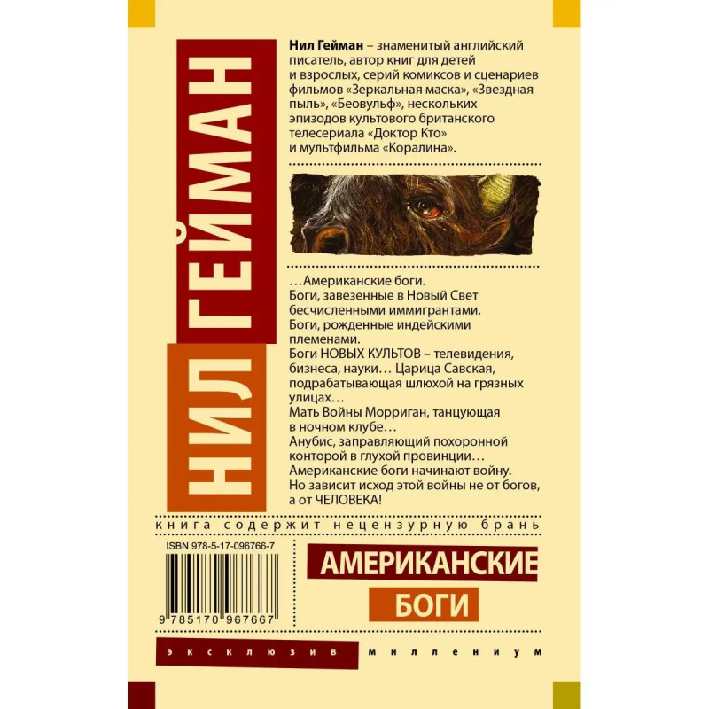 "Американские боги" - одно из самых известных произведений Геймана. Это роман о богах, привезенных в Америку людьми из разных уголков мира, почитаемых, а потом забытых, и о том, к чему не может остаться равнодушным ни один мужчина: о поисках отца, родины, возлюбленной, о символической и реальной смерти.