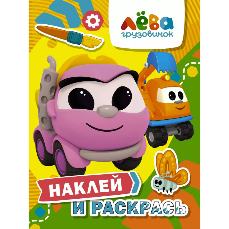 Познакомься с Грузовичком Лёвой и его друзьями! Наклей картинку на каждую страницу книги и раскрась машинки по образцу. Сделай мир ярче вместе с любимыми героями!