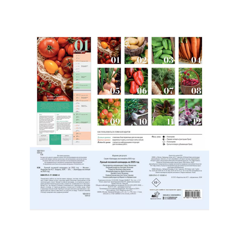 Опытные огородники начинают готовиться к посевным работам задолго до наступления сезона. В таком нелегком деле, как планирование работы на участке, может помочь Лунный посевной календарь. Необычный красочный макет отразит все лунные фазы, оказывающие влияние на рост и развитие растений, а также выделит красным цветом ячейки с неблагоприятными для посева днями, а зеленым с благоприятными. В каждом месяце нового года вы найдете описание одного овоща с особенностями его посева, ухода за ним, советами по выращиванию, сбору и хранению урожая. Ячейки с напоминаниями садово-огородных работ и полями для записей, помогут сделать планирование еще более эффективным.
