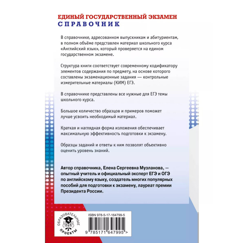 Справочник призван оказать практическую помощь в подготовке учащихся 11 классов и абитуриентов к единому государственному экзамену по английскому языку. Пособие составлено по тематическому принципу и содержит 8 разделов, которые включают справочную информацию по структуре ЕГЭ по английскому языку, материалы ко всем разделам экзамена ("Аудирование", "Чтение", "Грамматика и лексика", "Письмо" и "Говорение"), справочную лексико-грамматическую информацию, а также полный экзаменационный вариант ЕГЭ с комментариями к решению заданий. В каждый раздел ЕГЭ включены рекомендации по его выполнению, необходимый теоретический материал и образцы заданий экзаменационного типа, что позволит учащимся успешно подготовиться к экзамену.