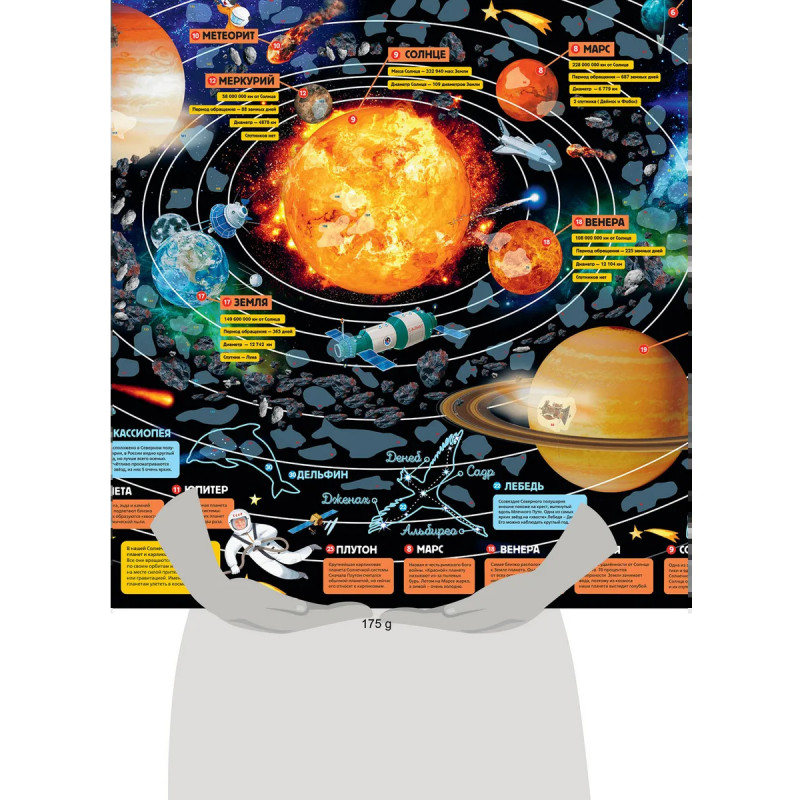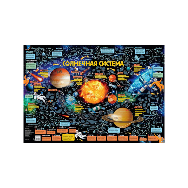 Карта ярко и наглядно представит планеты Солнечной системы, кометы, метеориты и другие небесные тела и расскажет о них, а также познакомит с созвездиями, которые можно увидеть ночном небе России. Интересные наклейки помогут детям лучше усвоить новые знания. Для старшего дошкольного и младшего школьного возраста