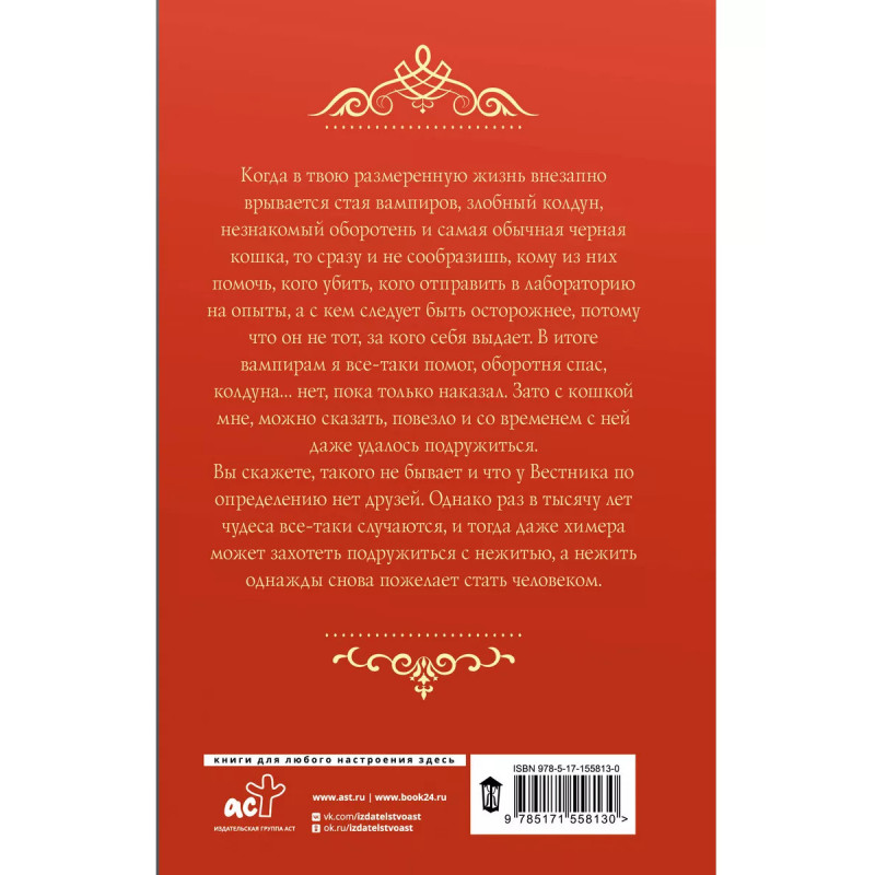 Когда в твою размеренную жизнь внезапно врываются стая вампиров, злобный колдун, незнакомый оборотень и самая обычная черная кошка, то сразу и не сообразишь, кому из них помочь, кого убить, кого отправить в лабораторию на опыты, а с кем следует быть осторожнее, потому что он не тот, за кого себя выдает. В итоге вампирам я все-таки помог, оборотня спас, колдуна нет, пока только наказал. Зато с кошкой мне, можно сказать, повезло и со временем даже удалось подружиться. Вы скажете: такого не бывает и у Вестника по определению нет друзей. Однако раз в тысячу лет чудеса все-таки случаются, и тогда даже химера может захотеть подружиться с нежитью, а нежить однажды снова пожелает стать человеком.