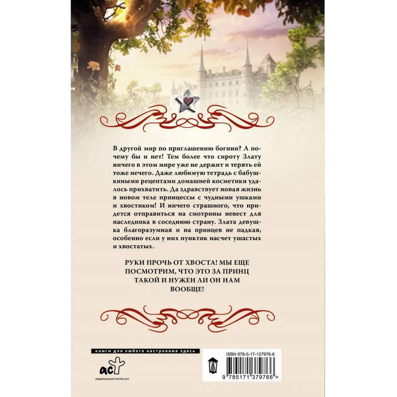 В другой мир по приглашению богини? А почему бы и нет! Тем более что сироту Злату ничего в этом мире уже не держит и терять ей тоже нечего. Даже любимую тетрадь с бабушкиными рецептами домашней косметики удалось прихватить. Да здравствует новая жизнь в новом теле принцессы с чудными ушками и хвостиком! И ничего страшного, что придется отправляться на смотрины невест для наследника в соседнюю страну. Злата девушка благоразумная и на принцев не падкая, особенно если у них пунктик насчет ушастых и хвостатых. Руки прочь от хвоста, мы еще посмотрим, что это за принц такой и нужен ли он нам вообще!
